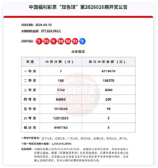 •   北京时间2026年3月10日,福彩双色球第26026期开奖,当期开奖号码为红球02 09 16 22 25 29,蓝球03。本期一等奖开出7注,单注奖金611万元,7注头奖分落6地,其中辽宁1注,江苏1注,广东1注,贵州2注,云南1注,陕西1注。二等奖开出168注,单注奖金18.6万余元。此外,因开奖前奖池高于15亿,增设5元福运奖(命中3枚红球即中奖),共开出9497762注。本期双色球销量为3.77亿余元,奖池余额25.18亿余元。