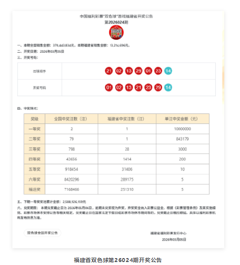 2026年3月5日晚福彩双色球第26024期开奖,当期开奖号码为“01、02、13、21、23、29+14”,一等奖中出2注,单注奖金1000万元,二等奖中出79注,单注奖金84.3万元。