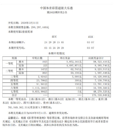 本期全国共开出10注一等奖,单注奖金587万元,其中2注选择追加,多得奖金469万元,追加头奖出自浙江和重庆;10注基础头奖分落上海、浙江、湖北、重庆、四川和贵州。二等奖开出147注,单注奖金6万余元,其中38注采用追加投注,每注多得奖金5万余元。本期全国销量为2.99亿元,开奖后奖池余额7.61亿,根据大乐透新规,下期固定奖奖金将按8亿以下对照。