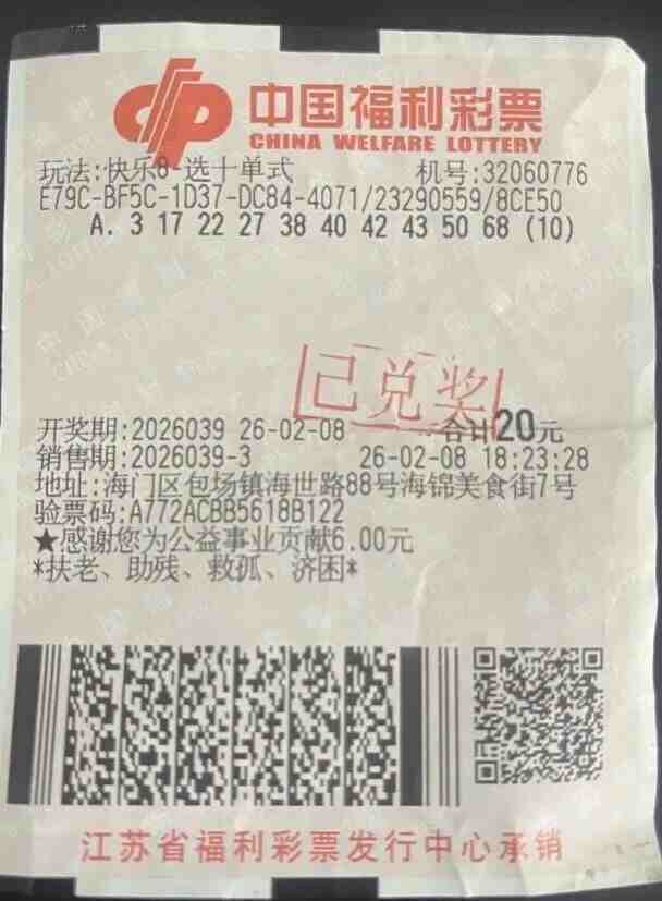 •   近日,南通市海门区包场镇海世路88号的32060776福彩站点传来好消息,一位购彩者凭借一张快乐8“选十”单式票,成功命中10注“选十中九”,揽获8万元奖金。