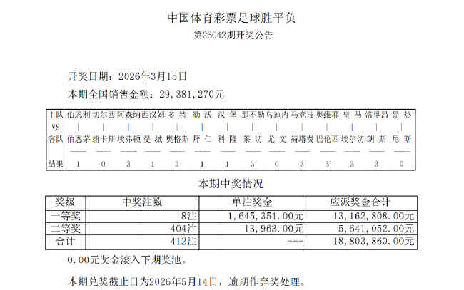 •   北京时间3月15日,足彩第26042期开奖结果揭晓。本期一等奖开出8注,单注奖金1645351元,二等奖开出404注,单注奖金13963元,任选九场开出6993注,单注奖金2031元。本期胜负彩销量为29,381,270元,任九投注总额为22,197,548元。