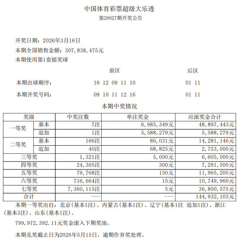 •   3月16日,超级大乐透第26027期开奖。前区开出号码09、10、11、12、16;后区开出号码01、11。本期全国销售3.07亿元,为国家筹集彩票公益金1.10亿元。