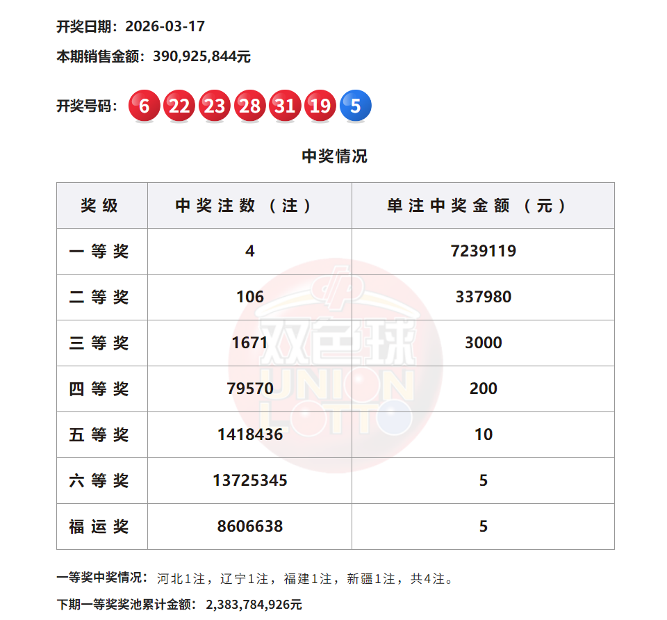此外,因开奖前奖池高于15亿,增设5元福运奖(命中3枚红球即中奖),共开出8606638注。