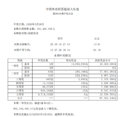 本期全国开出1注一等奖,单注奖金1000万元无追加,头奖花落福建。二等奖开出63注,单注奖金28万余元,其中11注采用追加投注,每注多得奖金22万余元。本期全国销量为3.03亿元,开奖后奖池余额8.61亿,根据大乐透新规,下期固定奖奖金将按8亿以上对照。
