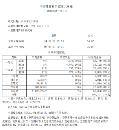 本期全国共开出9注一等奖,单注奖金757万元,其中2注选择追加,多得奖金606万元,2注追加头奖分别出自湖南和贵州;7注基本头奖中,安徽独中5注,经系统检索,这5注头奖均出自安徽省亳州市蒙城县幸福路玖隆国际C区27#108铺3427220017体彩门店,爆3788万大奖,剩余2注基本头奖分别花落河北和四川。二等奖开出82注,单注奖金28.5万余元,其中17注采用追加投注,每注多得奖金22.8万余元。本期全国销量为3.21亿元,开奖后奖池余额7.62亿,根据大乐透新规,下期固定奖奖金将按8亿以下对照。
