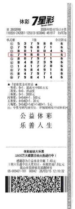 •   2026年3月15日,体彩7星彩第26028期开奖,苏州购彩者马先生凭借一组坚守多年的号码,喜中1注一等奖,揽获500万元奖金。日前,他已前往江苏省体彩中心兑奖。