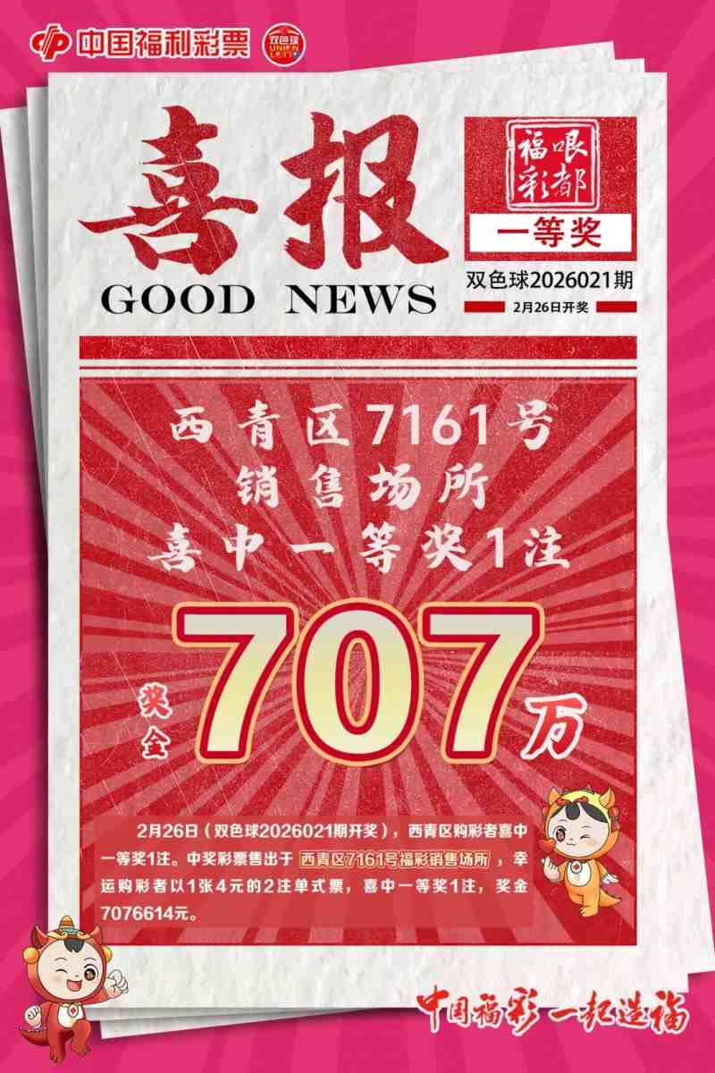 •   2月26日,福彩双色球第2026021期进行了开奖,天津购彩者好运爆棚,再次斩获707万元一等奖!这张中奖彩票出自西青区7161号福彩销售点,幸运儿仅用一张4元的2注单式票,便将1注一等奖收入囊中,奖金高达7076614元。