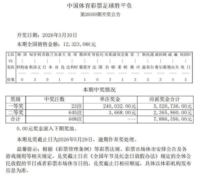 •   北京时间3月30日,胜负彩第26050期开奖结果揭晓。本期足彩头奖共开出23注,单注奖金240,032元;二等奖开出645注3668元;任九开5210注1766元。本期胜负彩销量为12,323,086元,任九投注总额为14,376,926元。