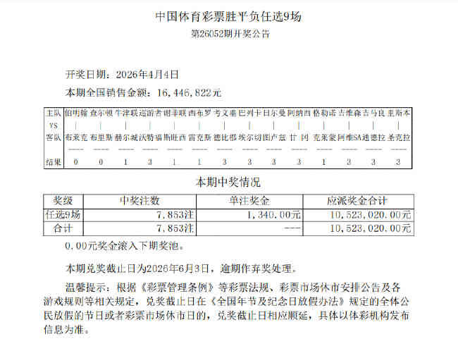 •   北京时间4月4日,胜负彩第26052期任九开奖结果揭晓。本期任九开出7853注,单注奖金1340元。本期任九投注总额为16,446,822元。
