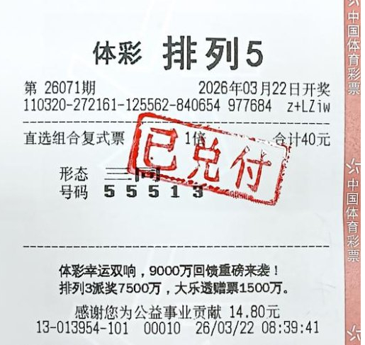 •   2026年3月22日,体彩排列5第26071期开奖,中奖号码揭晓为“5、5、1、5、3”。当日,宿迁市沭阳县的3213013954体彩网点传来振奋人心的消息,购彩者陈先生凭借1注排列5一等奖,成功揽获10万元奖金。