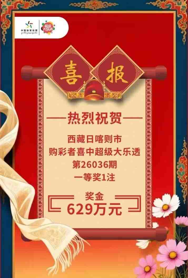 •   2026年4月6日,西藏日喀则市传来一则令人振奋的消息:一位购彩者在超级大乐透第26036期中一举夺得一等奖1注,奖金高达629万元!这一喜讯不仅让中奖者沉浸在巨大的喜悦之中,也为全区购彩者注入了满满的正能量与希望。