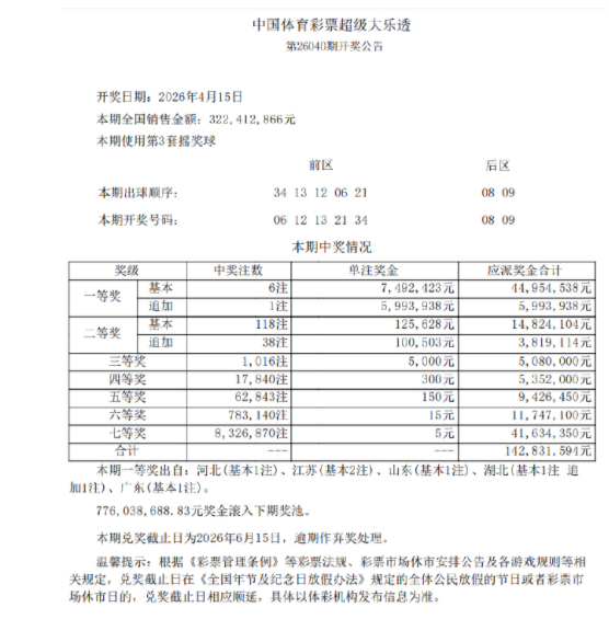 本期全国开出6注一等奖,单注奖金749万余元,其中1注选择追加,多得奖金599万余元。1注追加头奖1348万花落湖北,5注基本头奖分落江苏(2注)、河北、山东和广东。二等奖开出118注,单注奖金12.5万元,其中38注采用追加投注,每注多得奖金10万余元。本期全国销量为3.22亿元,开奖后奖池余额7.76亿元,根据大乐透新规,下期固定奖奖金将按8亿以下对照。