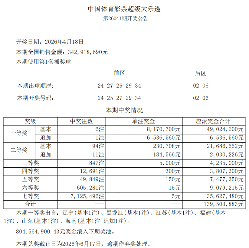 •   北京时间4月18日晚,体彩大乐透第26041期开奖,当期开奖号码为前区24 25 27 29 34,后区02 06。