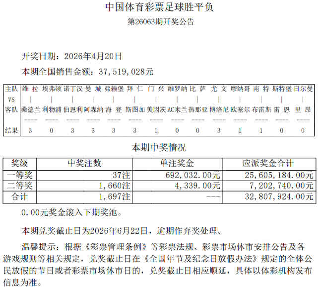 •   北京时间4月20日,足彩第26063期开奖结果揭晓。本期一等奖开出37注,单注奖金692,032元,8,796,675.33元滚存被清空;二等奖开出1660注4339元;任九开6241注2314元。本期胜负彩销量为37,519,028元,任九投注总额为22,572,232元。