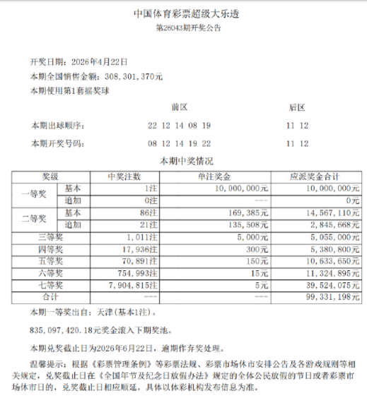 本期全国仅开出1注一等奖,单注奖金1000万元无追加,头奖花落天津。二等奖开出86注,单注奖金16.9万余元,其中21注采用追加投注,每注多得奖金13.5万余元。本期全国销量为3.08亿元,开奖后奖池余额8.35亿,根据大乐透新规,下期固定奖奖金将按8亿以上对照。