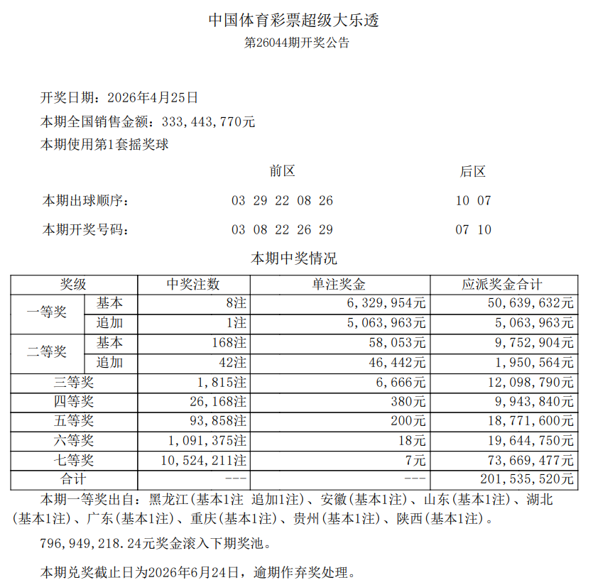 •   北京时间4月25日晚,体彩大乐透第26044期开奖,当期开奖号码为前区03 08 22 26 29,后区07 10。