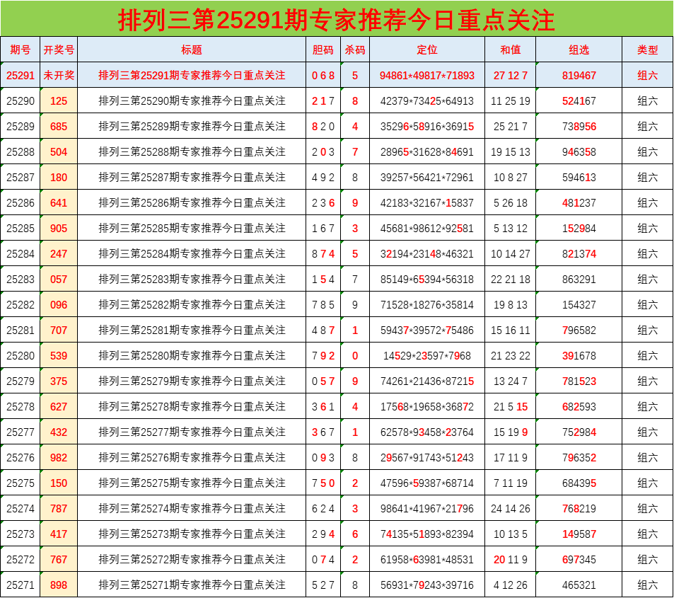 • 排列三25291期胆码预测分析 专家推荐068