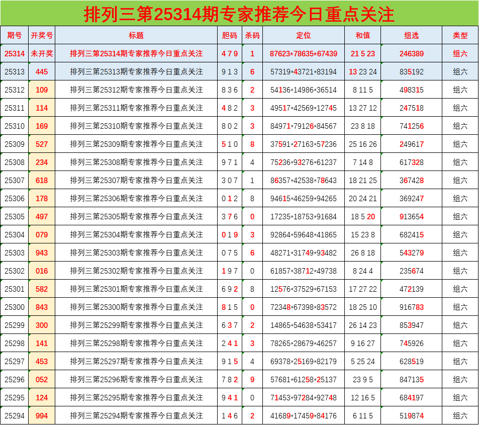 • 排列三25314期胆码预测分析 专家推荐479