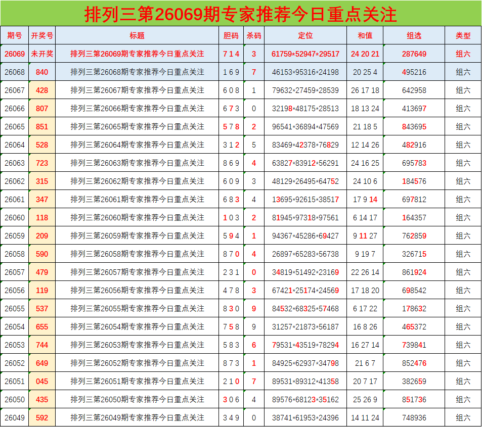 • 排列三26069期胆码预测分析 专家推荐714