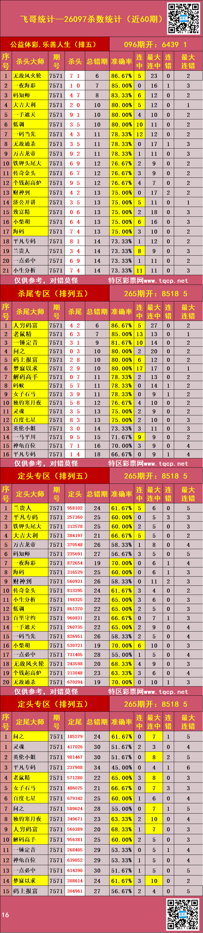 • 排列五26100期胖哥统计