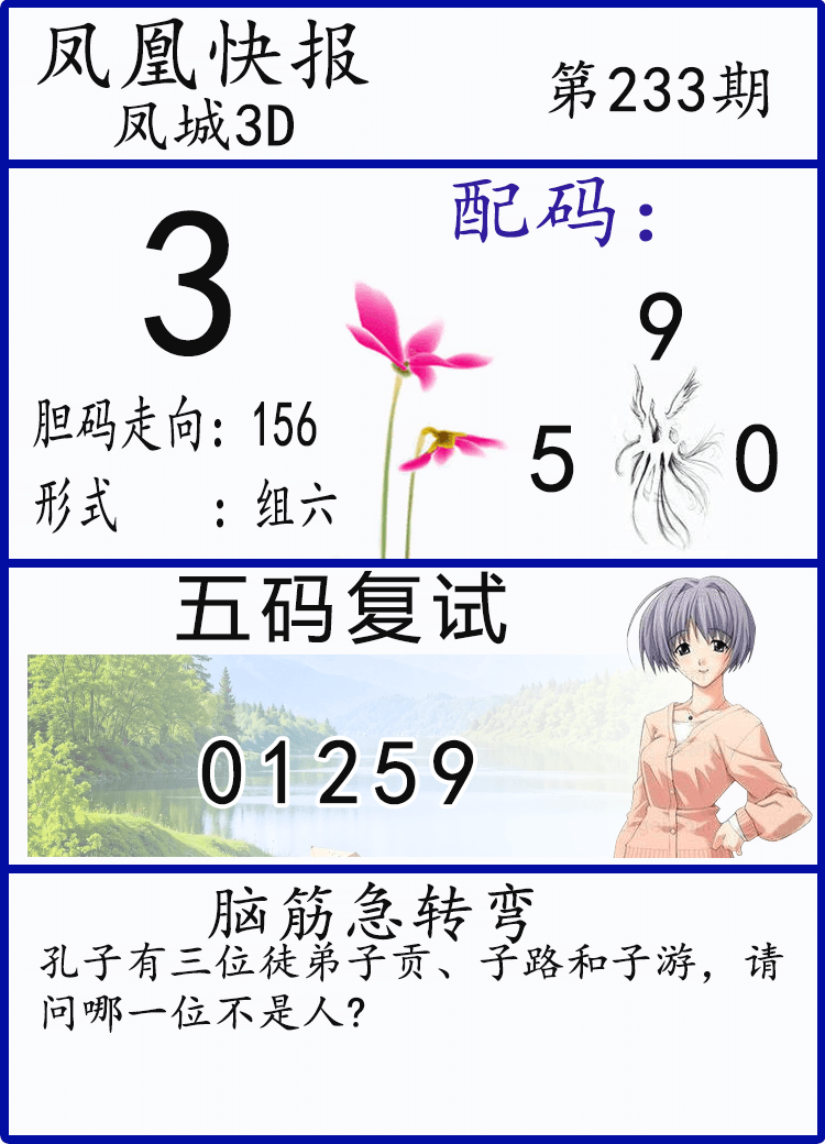 • 25233期: 福彩3D财神精选胆码杀码