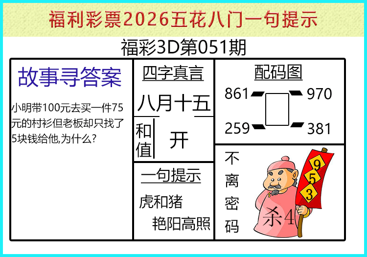 • 26065期: 福彩3D财神精选胆码杀码