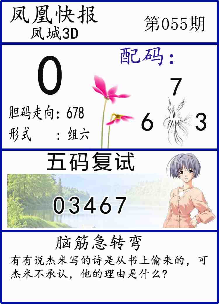 • 26055期: 福彩3D财神精选胆码杀码