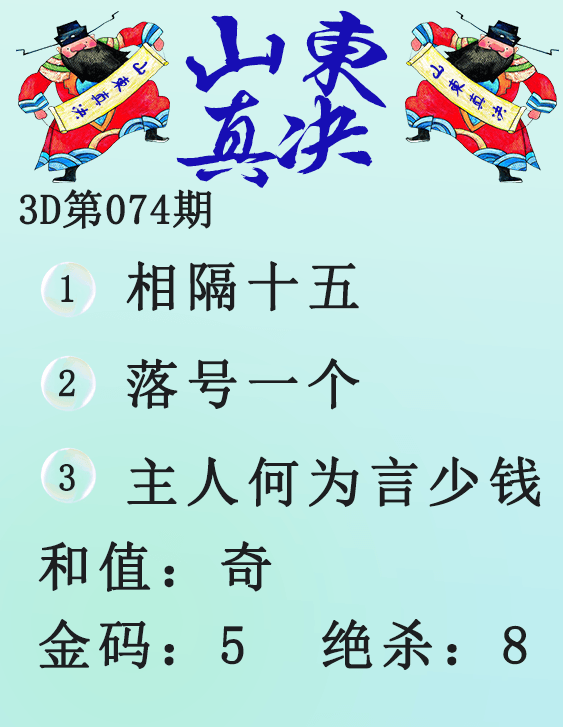 • 26074期: 福彩3D财神精选胆码杀码