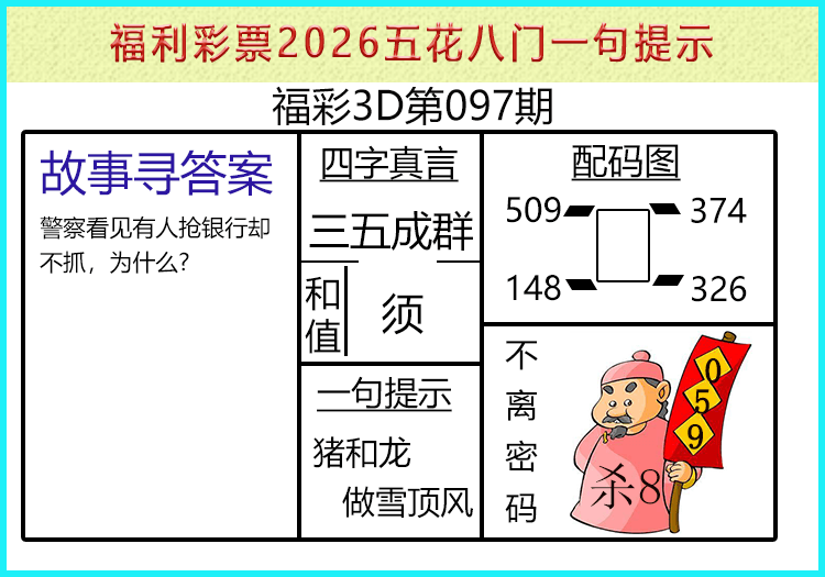 • 26097期: 福彩3D财神精选胆码杀码
