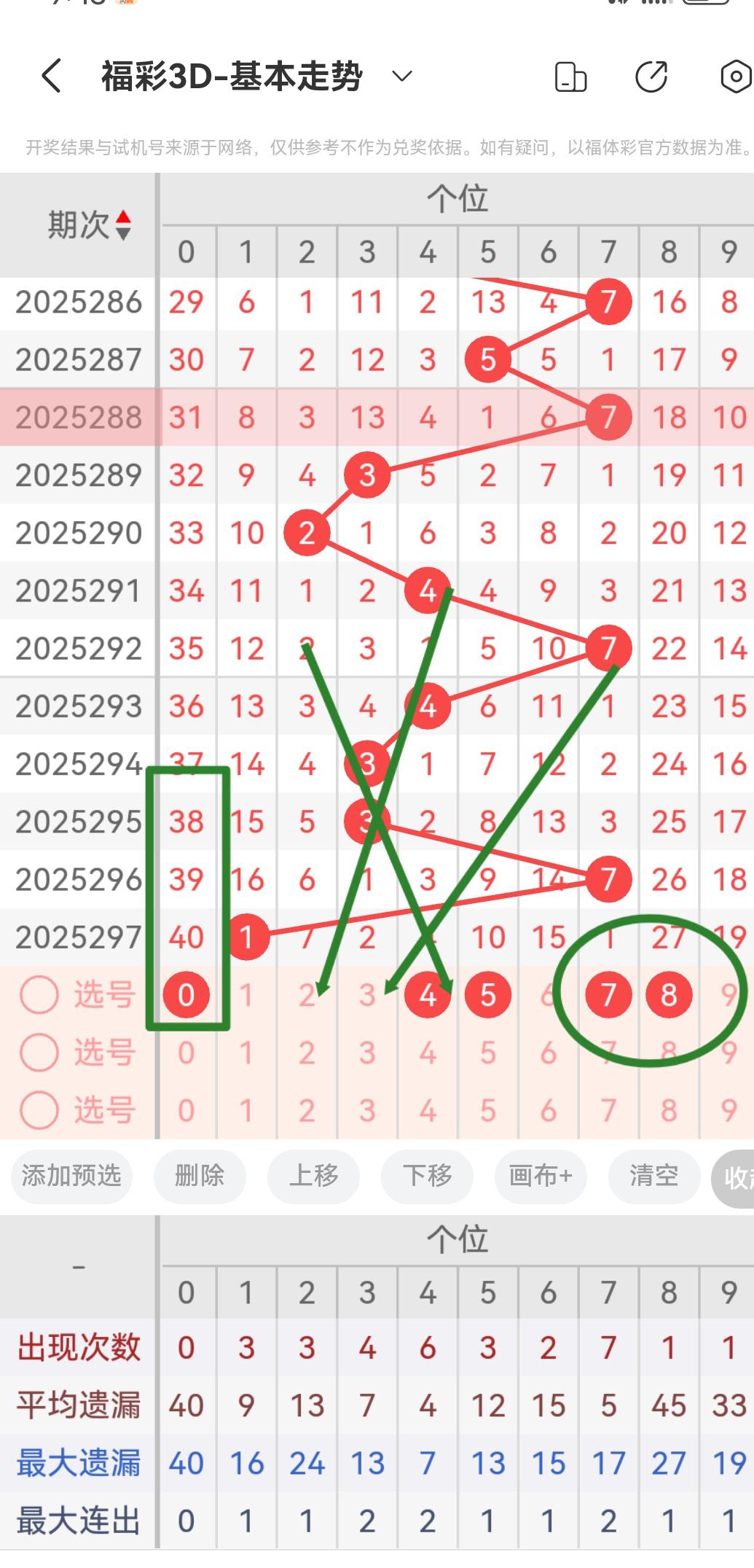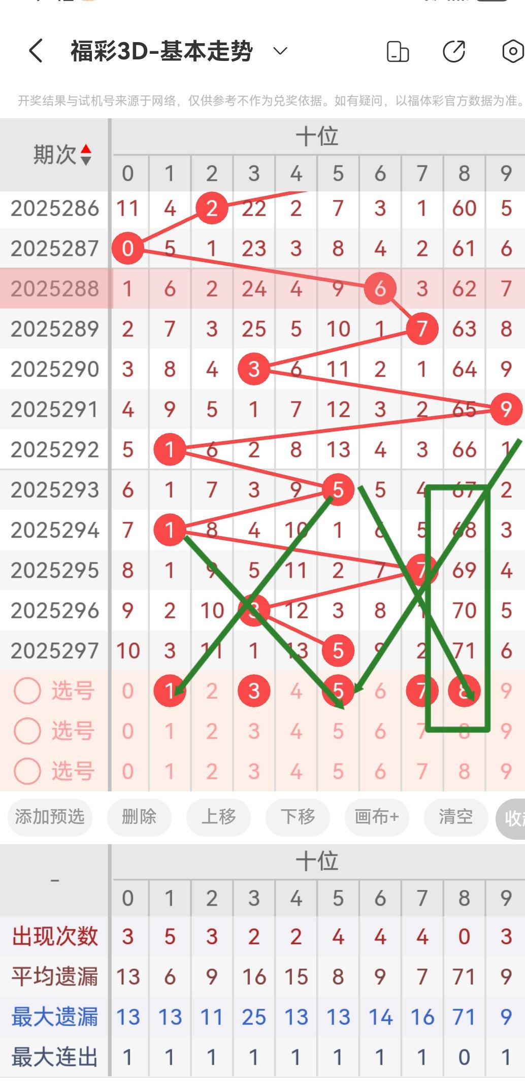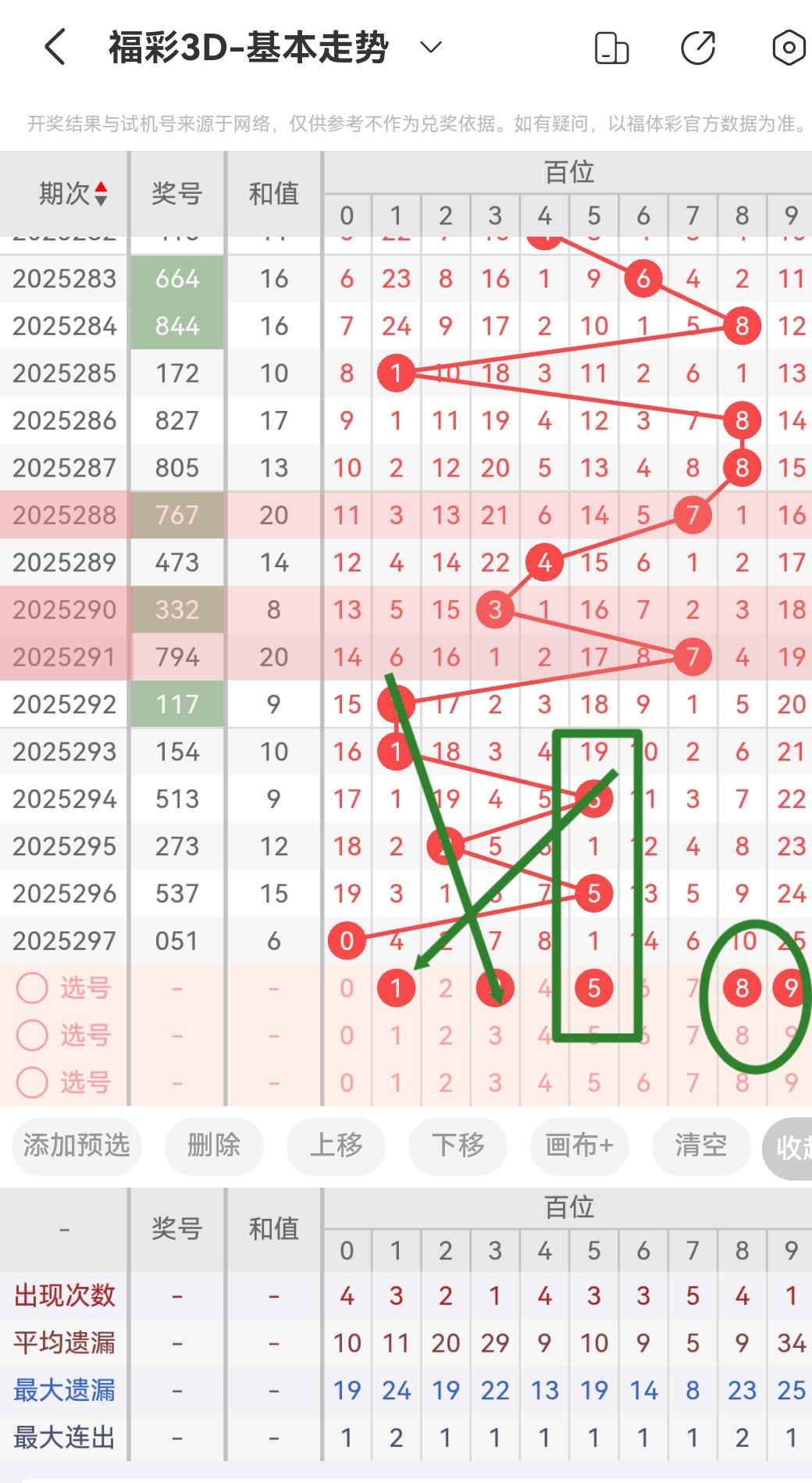 从2025297期开出的号码来看个位十位百位的号码球遗漏期数,以及个位十位百位的号码球走势!