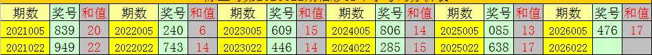 则,第2026022期奖号可以参考第2026005期奖号:476。