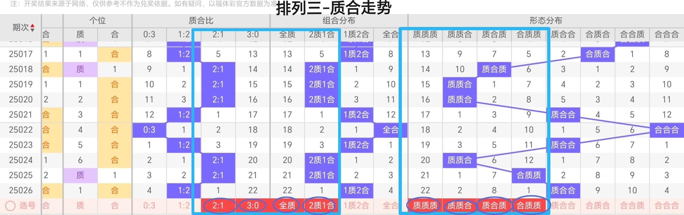质合比分析:上期开出1:2形态,我们可以考虑在本期大胆的杀掉质合比1:2,本期重点质合比是2:1,防质合比3:0。