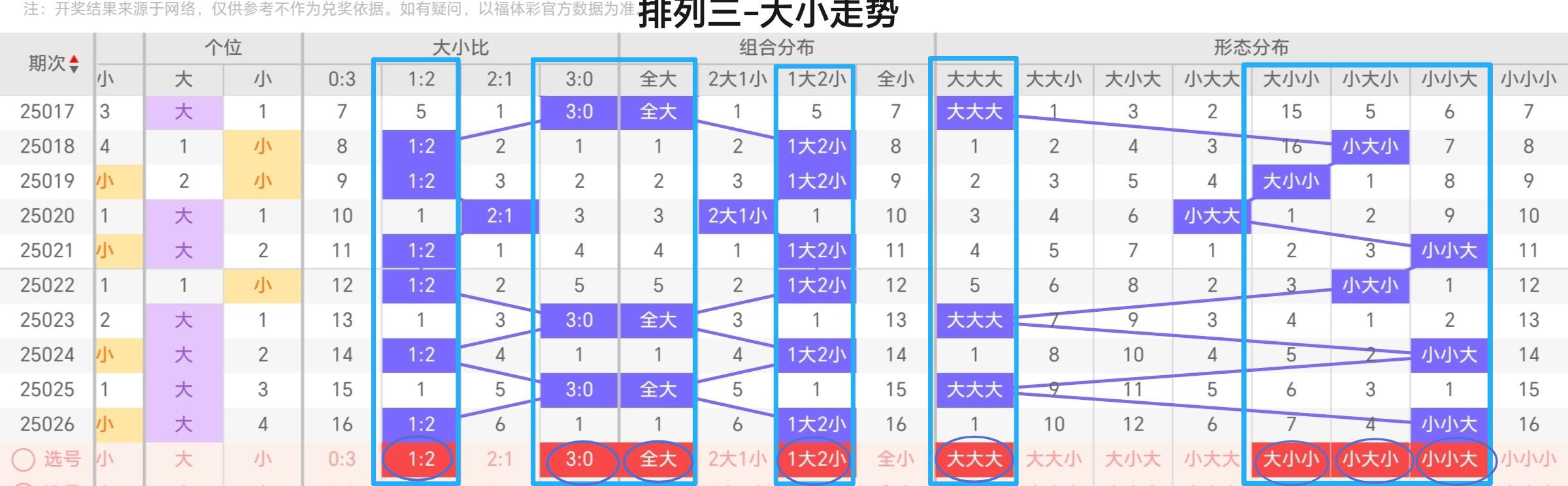 大小比分析:上期开出1:2形态,我们可以考虑在本期大胆的杀掉大小比2:1,本期重点大小比是1:2,防大小比3:0。