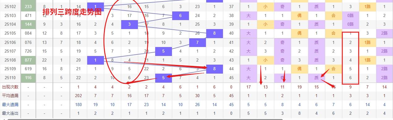 排列三 跨度分析:从上图可以看出近100期的跨度大小比约为51比49,跨度奇偶比约为53比47总体来看还是比较均衡的,但跨度大小之间有点差异。我们再从历史开出5跨后下一期7跨度数据来做参考。最近10期跨度大小比约为6:4近期开出小数跨度过多返回大数跨度的概率更高一点。历史开奖近2期出5跨以后的走势为037期开出5跨后下一期走6跨走出1振幅,第045期开出5跨后下一期走2跨走出3振幅第057期开出5跨后下一期开出4跨走出1个振幅。连续多期小振幅。近期排列三跨度走势中,4跨和7跨出现频率较低,遗漏值逐渐增大,存在回补需求。从历史数据来看,冷跨往往在持续低迷后迎来反弹,因此近期需重点关注4跨和7跨的复出可能。在投注策略上,可适当防守这两大冷跨,同时结合热号跨度进行搭配, 综合以上分析后得出,本期预计跨度遵从历史会走小振幅,出5跨度后容易走出2到4个跨度振幅的对称形态。跨度走出2到4个振幅看好的跨度有2467,所以第2025111期排列三跨度推荐2467跨。本文由为彩网钱是生命动力所著,请勿转载