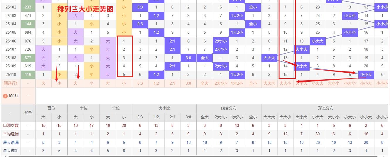 排列三 大小形态分析:从大小走势图上可以看出排列三100期内百位大小比约为55比45,十位大小比约为48:52,个位大小比约为51比49,除了十位奇数比偶数多,百位和个位是偶数比奇数多。历史数据近2期开出小小大下一期的走势为,第027期开出小小大第028期开大大小。第035期开出小小大后第036期开小大小,第043期开出小小大后044期开小大大。可以看出开出小小大的时候,结合遗漏数据再加上开出小小大形态后容易进行下一个类型变化。近期排列三大小走势中,小大小组合表现活跃,呈现明显的热态趋势。从历史数据来看,热号组合往往具有延续性,短期内仍有回补可能。建议在关注该形态的同时,可适当搭配冷态组合进行防守,以平衡投注风险。投注时建议结合具体位选大小分布,并参考近期整体大小比例进行综合判断 所以排列三第2025111期大小形态推荐小大小防大小大。本文由为彩网钱是生命动力所著,请勿转载