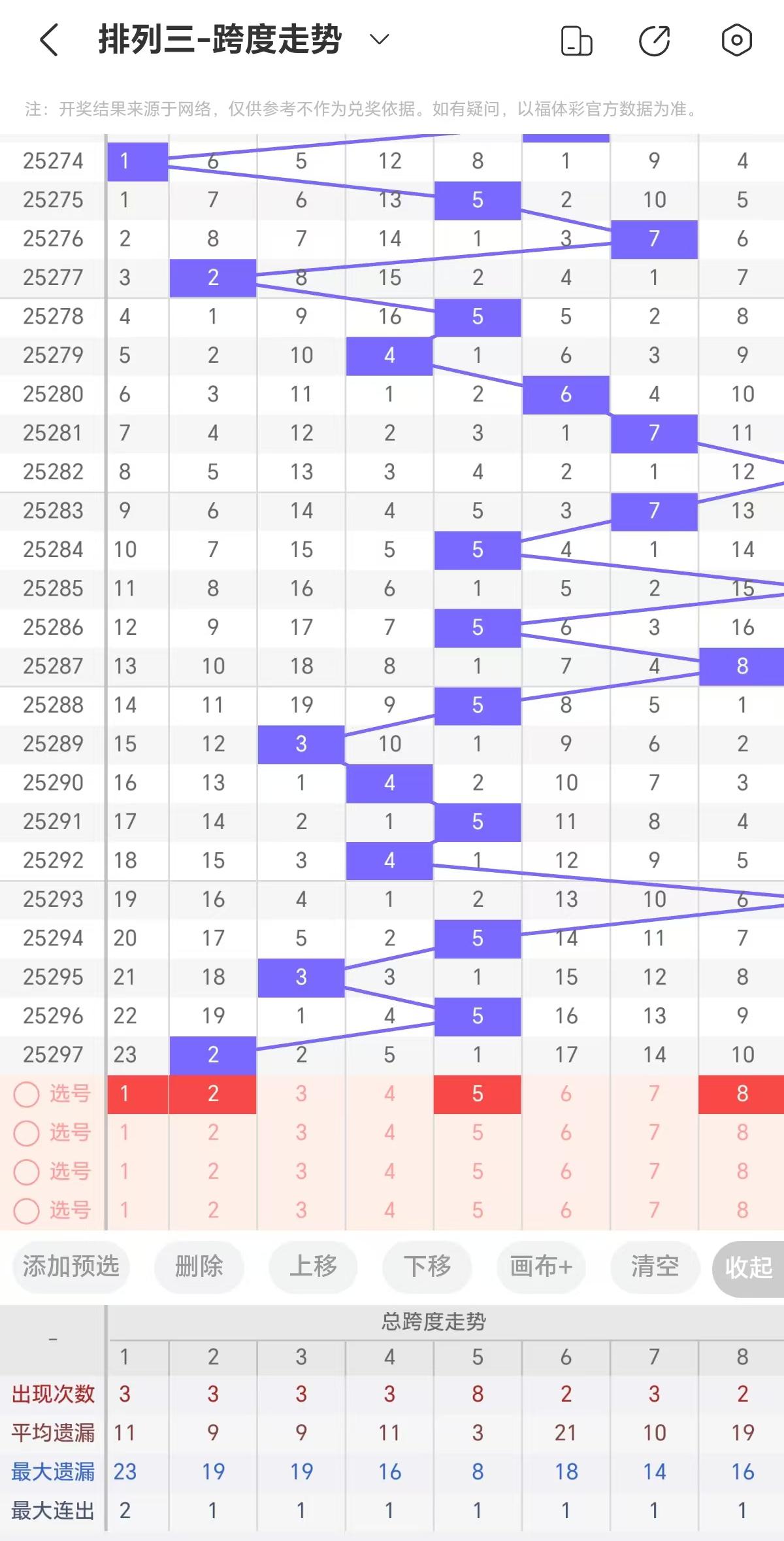 跨度:上期开出跨度为2,近几期开出跨度为9-5-3-5-2,如果开出跨度5的号码就形成9-5-3-5-2-5的奇数跨度5走势的关系,再结合走势图分析,本期主要关注跨度4的号码组合。2026-04-05 22:00:28