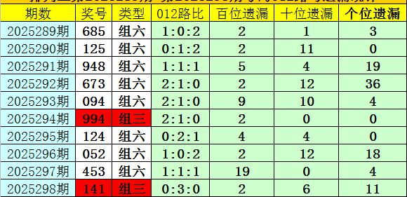 • 开奖回顾:排列三第2025298期奖号为:141,类型为组三,号码012路比为0:3:0,百十个位号码直选分别遗漏2期、6期和11期。