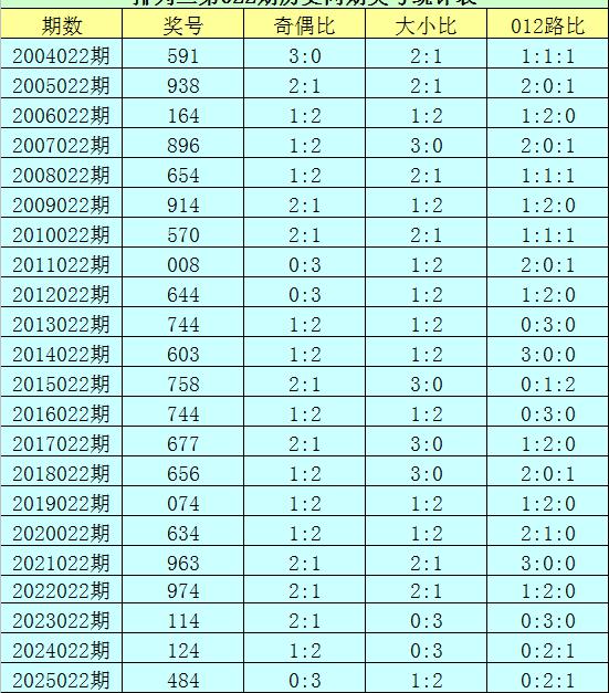 • 排列三第2026022期开奖日期:2026年1月22日,历史上第022期已开出了22次奖号,历年同期号码分别为:591、938、164、896、654、914、570、008、644、744、603、758、744、677、656、074、634、963、974、114、124、484。