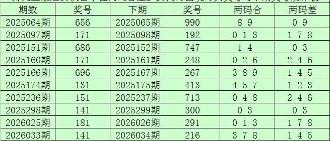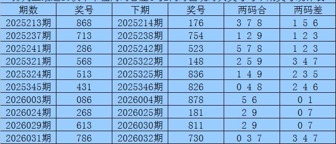 百个位合差分析:上期奖号百个位开出11组合,两码合为2,两码差为0,最近10次百个位两码合2与两码差0同时出现时,其奖号和下期奖号分别为: