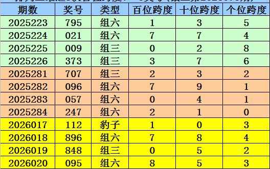 第2026017-第2026019期奖号:112、896、848,其下期奖号为:095,首位号码跨度为8;