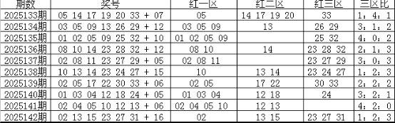 一区上期走温,出现1个奖号,近10期开出24个红球,表现非常活跃,本期预计走温,开出1-2个红球,参考号码02、06;二区上期走温,开出2个红球,近10期共开出16个红球,走势相对较冷,本期预计继续温冷,在2个以内出号,注意号码20;三区上期表现较热,出现3个奖号,近10期共开出20个红球,出号与理论个数持平,本期看好走热,开出3个红球,看好号码25、29、33;