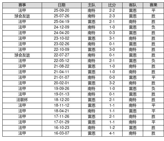 雷恩 VS 南特两队近10年的交战次数为23场,雷恩15胜5平3负,赢球概率为65.2%,平局概率为21.7%,输球概率为13.0%。