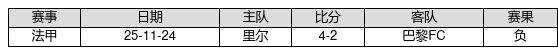 巴黎FC VS 里尔两队近10年的交战次数为1场,巴黎FC0胜0平1负,赢球概率为0.0%,平局概率为0.0%,输球概率为100.0%。