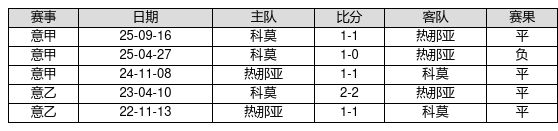 热那亚 VS 科莫两队近10年的交战次数为5场,热那亚0胜4平1负,赢球概率为0.0%,平局概率为80.0%,输球概率为20.0%。