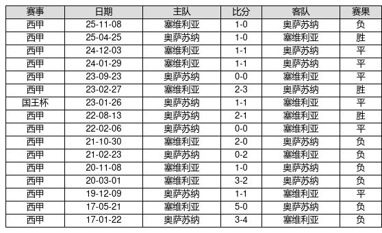 奥萨苏纳 VS 塞维利亚两队近10年的交战次数为16场,奥萨苏纳3胜6平7负,赢球概率为18.8%,平局概率为37.5%,输球概率为43.8%。