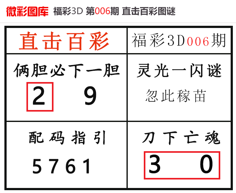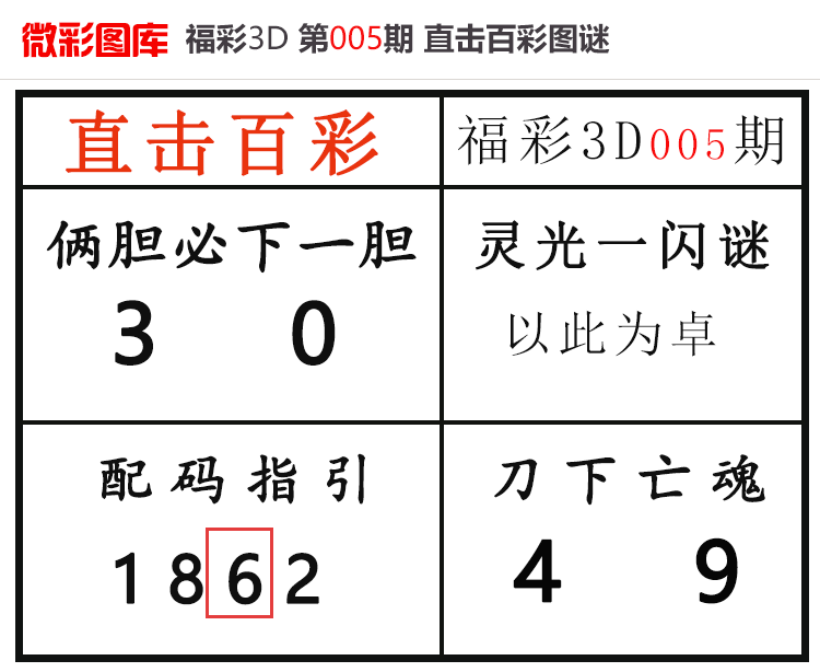 • 26020期:福彩3D【直击百彩】微彩图谜 上期杀码红、胆码红2