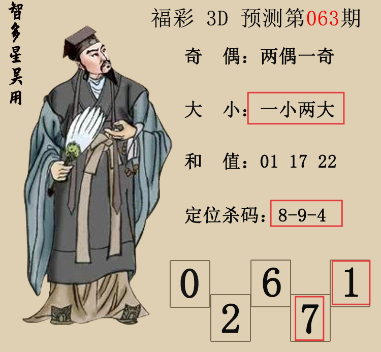 • 26063期:福彩3D【智多星吴用】预测图 上期奇偶红、杀码红