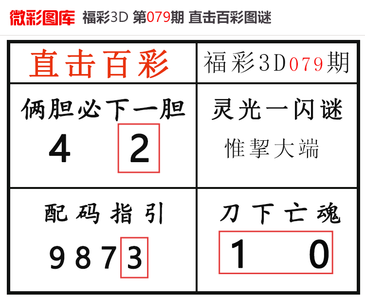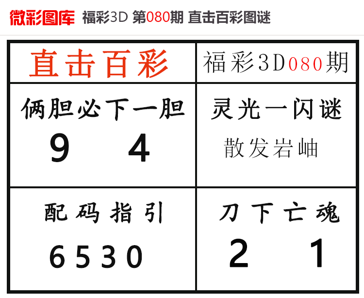 • 26080期:福彩3D【直击百彩】微彩图谜 上期杀码红、胆码红2