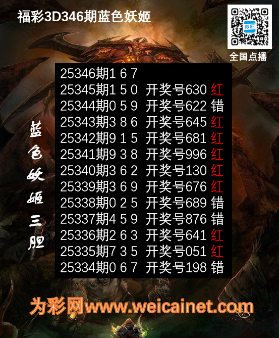 • 福彩3D26025期胆码 蓝色妖姬胆码图