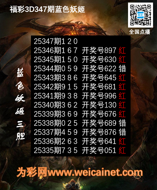 • 福彩3D25347期胆码 蓝色妖姬胆码图
